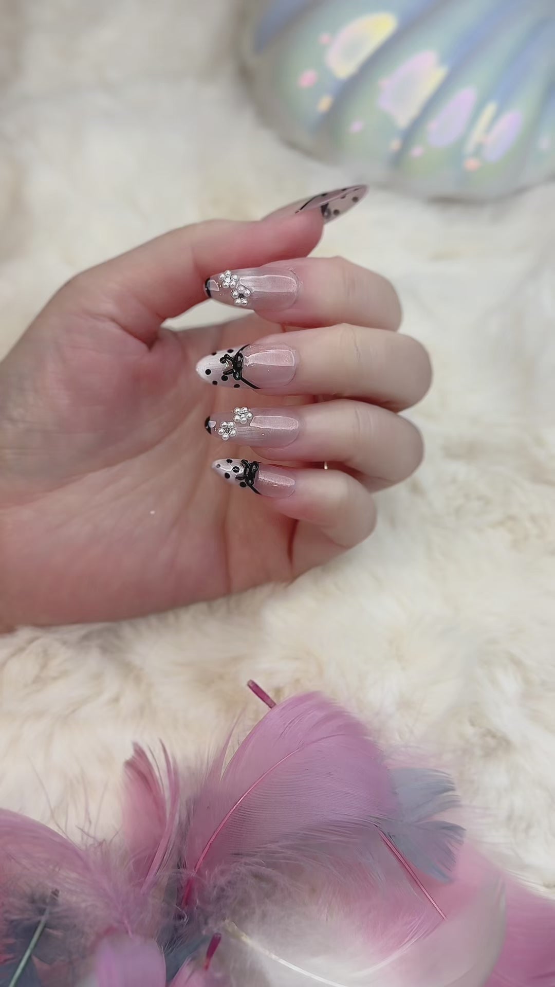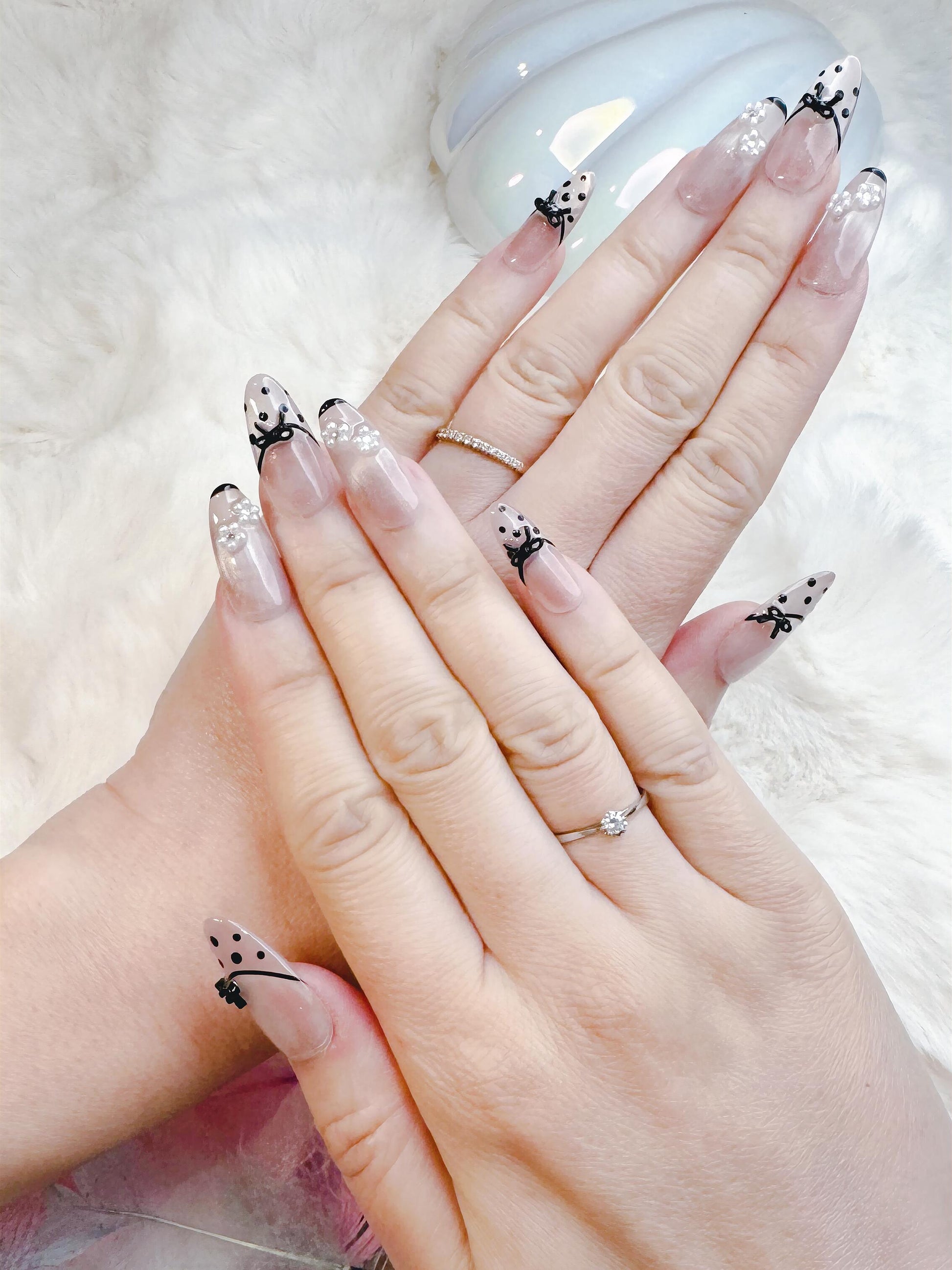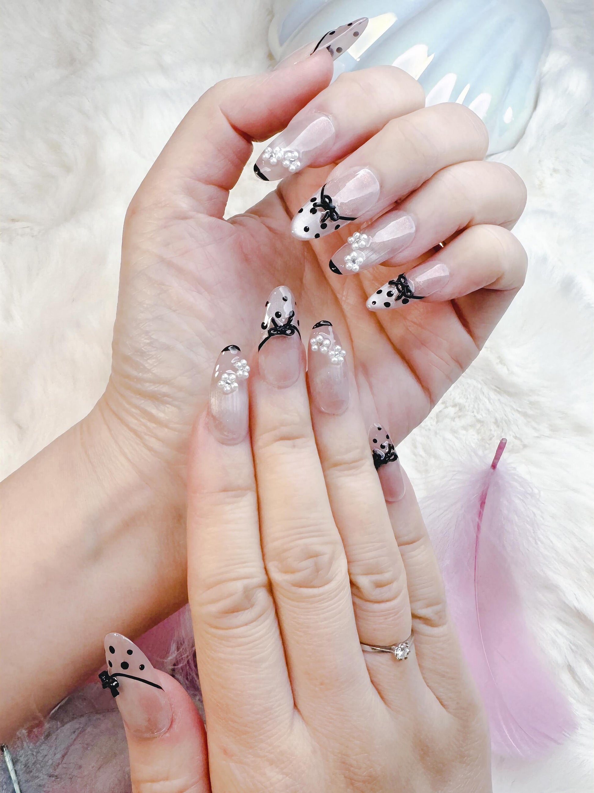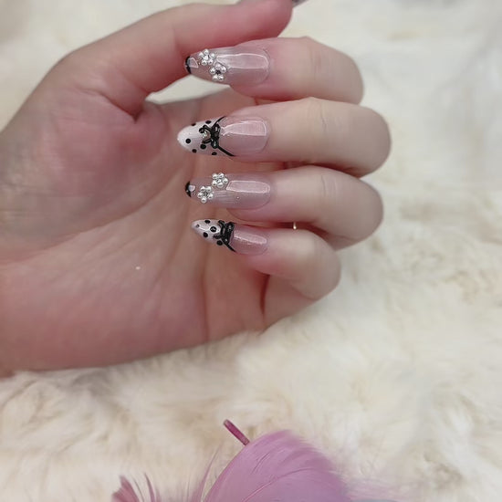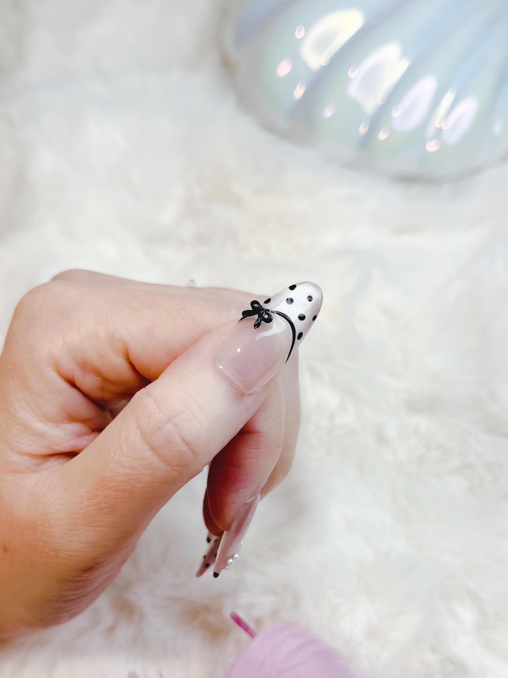 Ballerina’s Bow - Crafted on a soft, sheer nude base, each almond-shaped nail features a crisp black French tip, hand-painted dainty bows, and subtle polka dots for a playful yet polished look. Tiny, sparkling crystal accents add just the right amount of understated glamour, making them perfect for both everyday grace and special occasions.