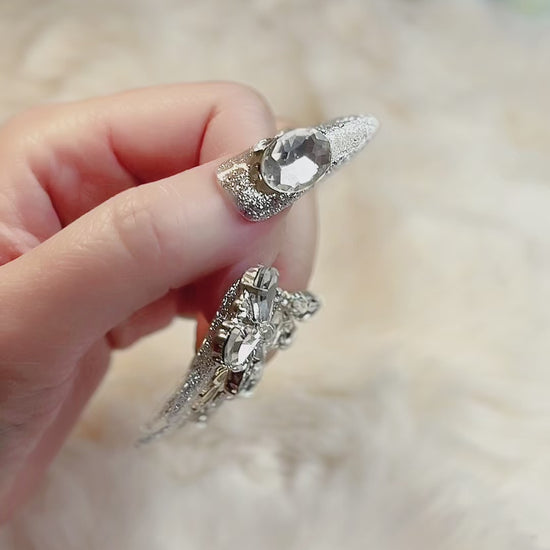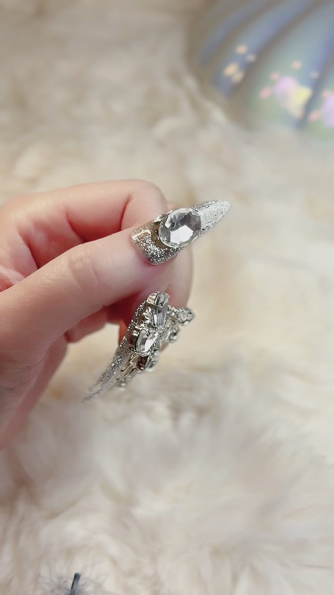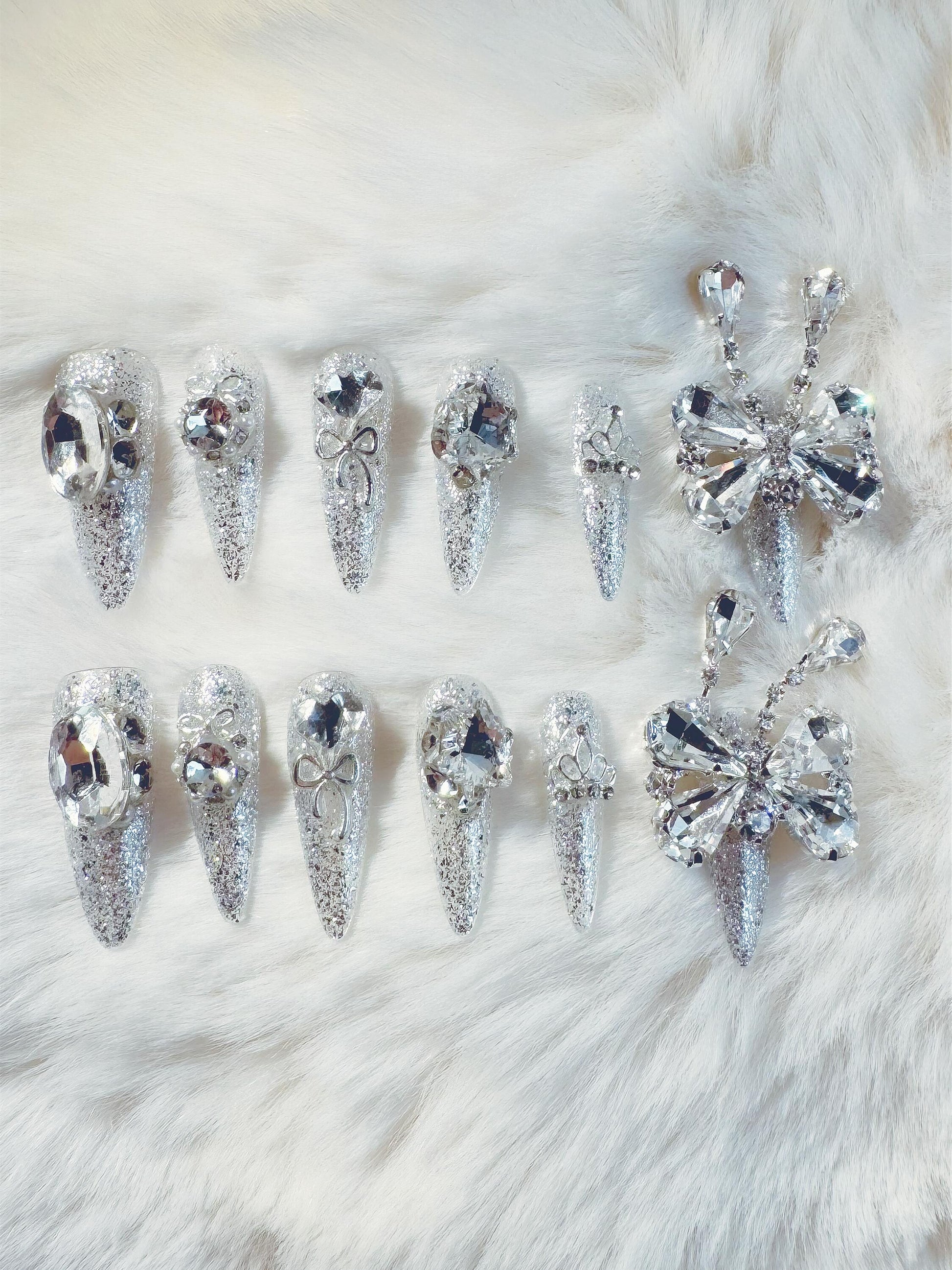 Turn every moment into a spotlight with our Bridal Fantasy Nails. Silver glitter, diamond-like butterfly, and sparkling rhinestones make this set perfect for brides, photoshoots, or any luxe occasion. Handcrafted to shine like jewelry for your hands. šāØ