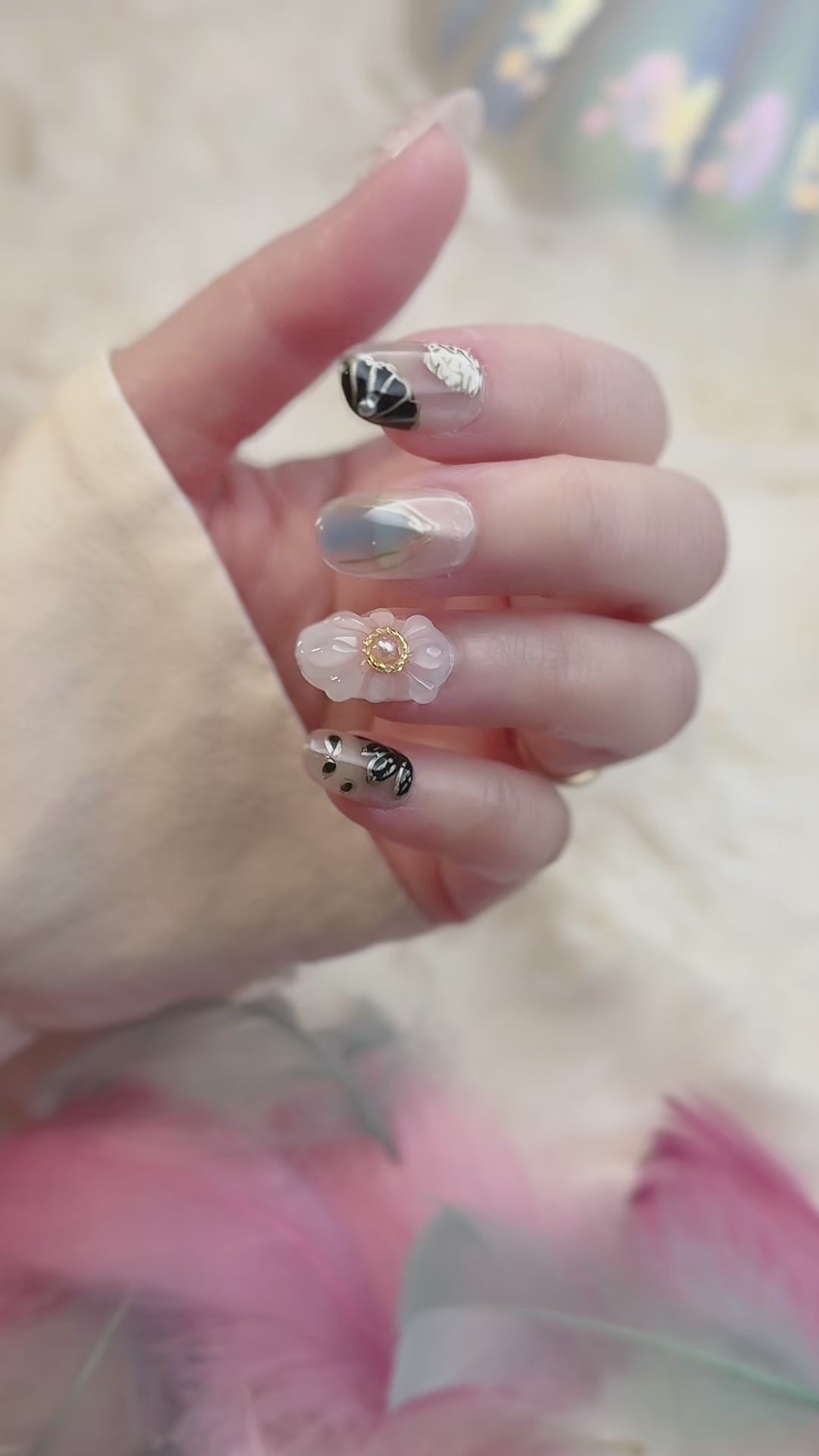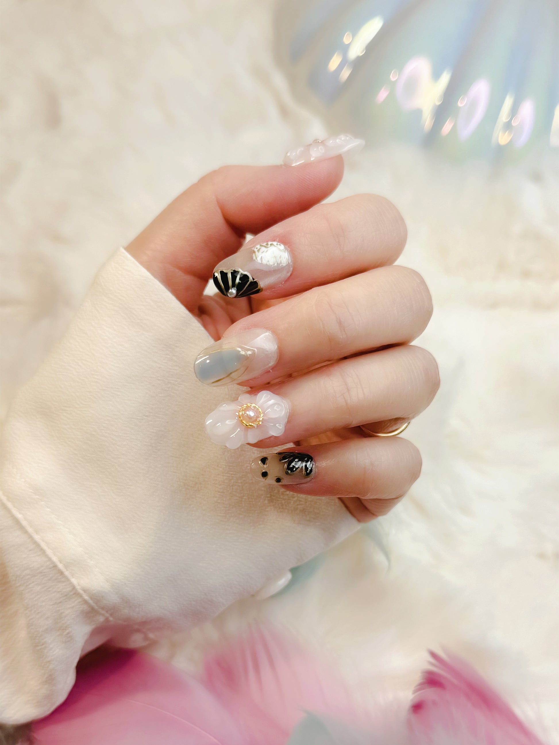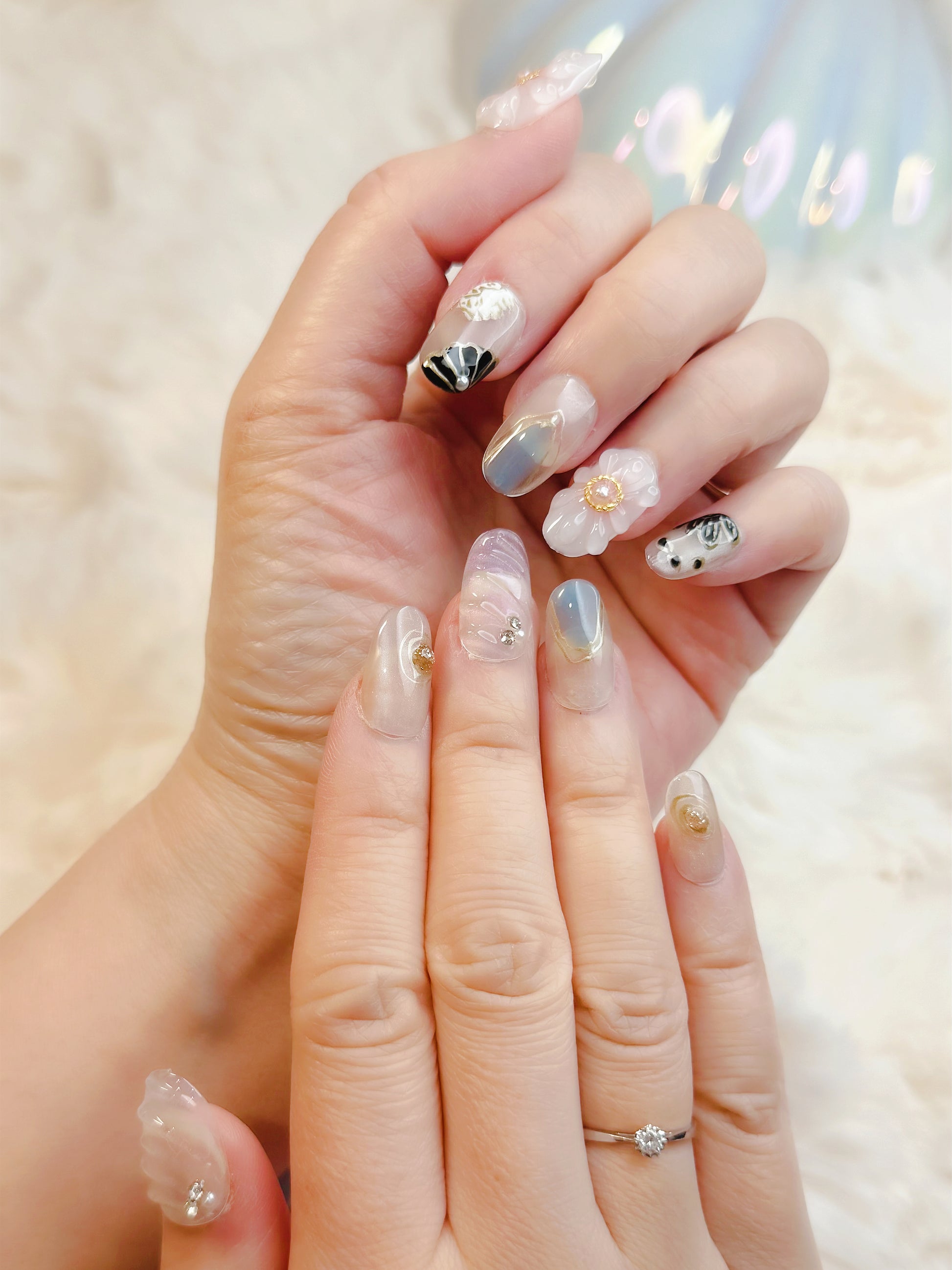 Float through light and elegance with Ethereal Bloom. This dreamy set blends sheer nude tones, opal shimmer, and hand-sculpted 3D blossoms kissed with gold. Each nail glows like morning light through petals — soft, radiant, and truly one of a kind.