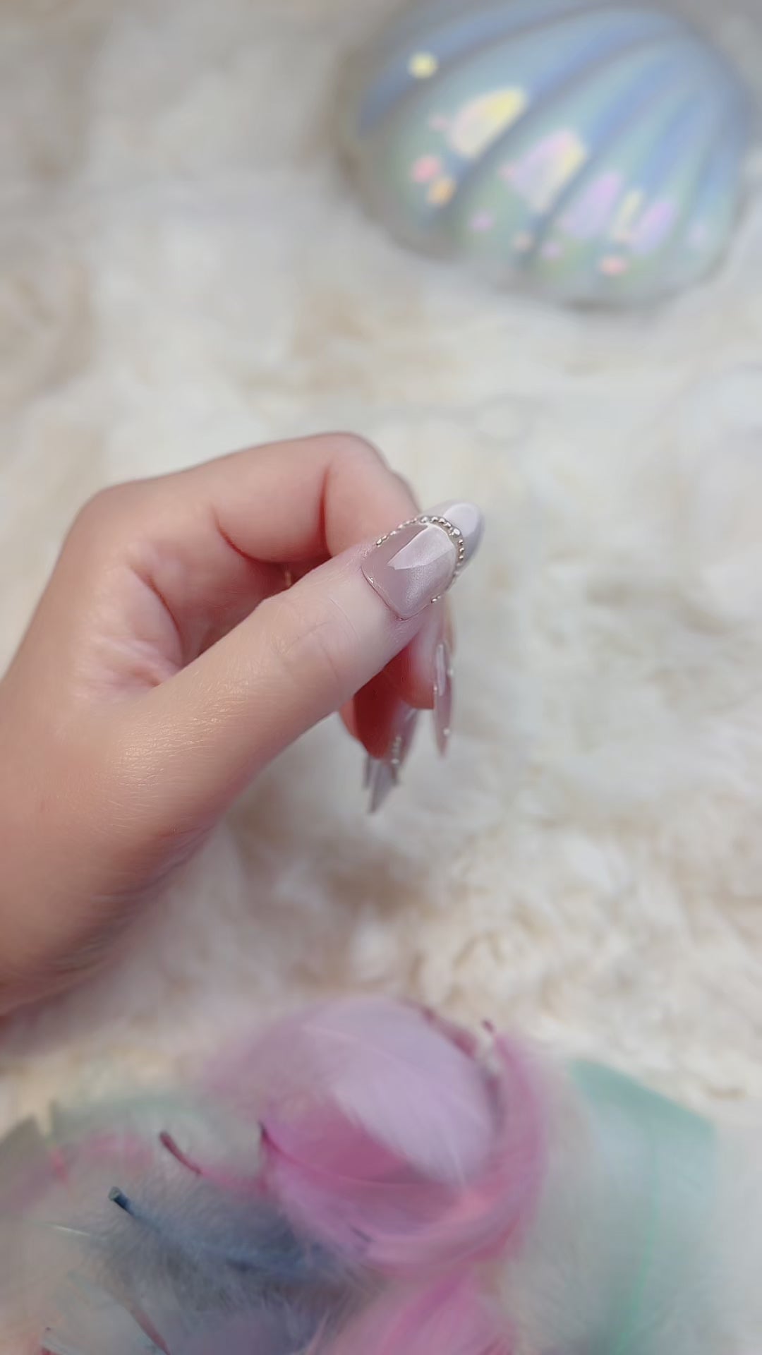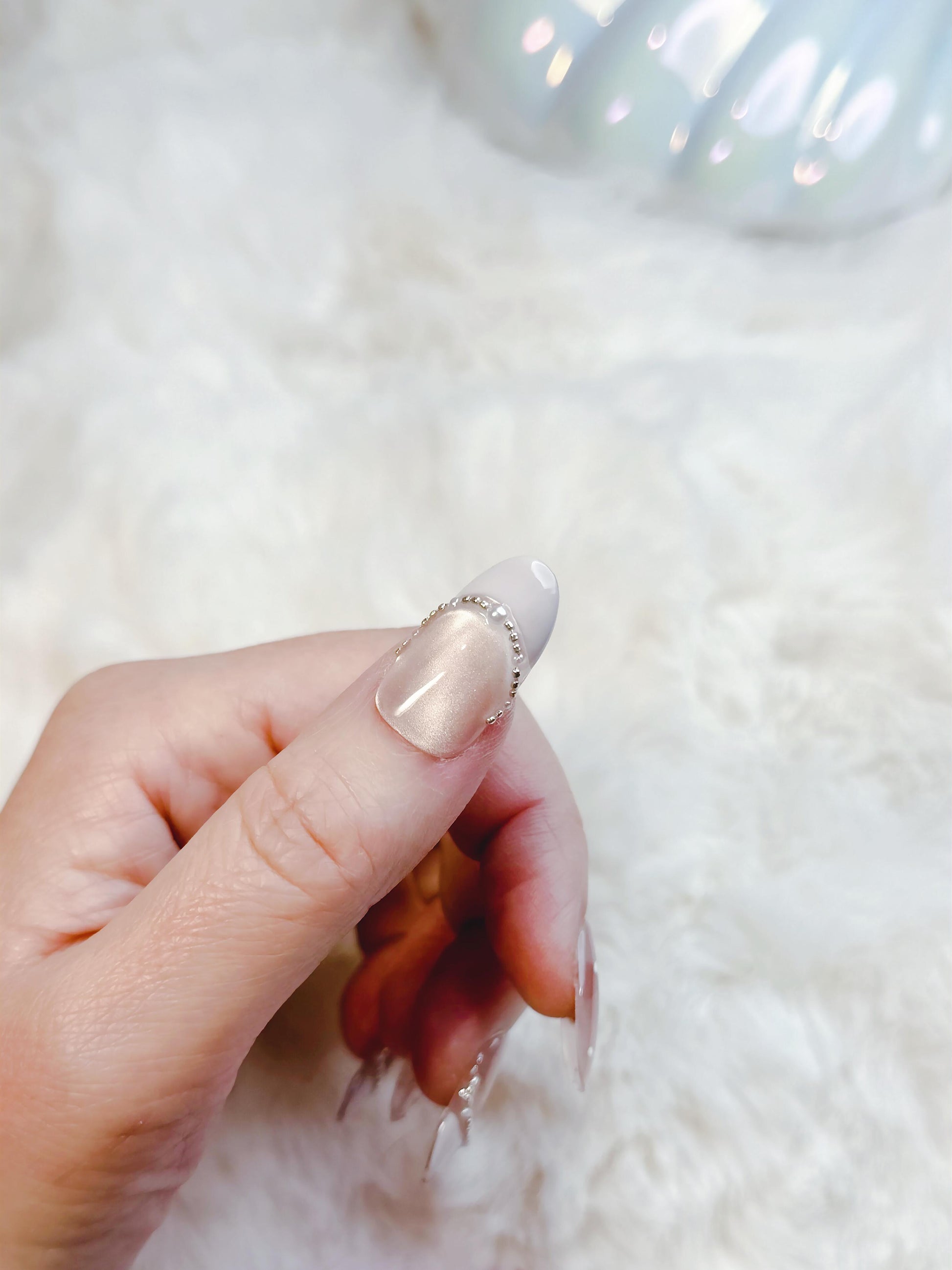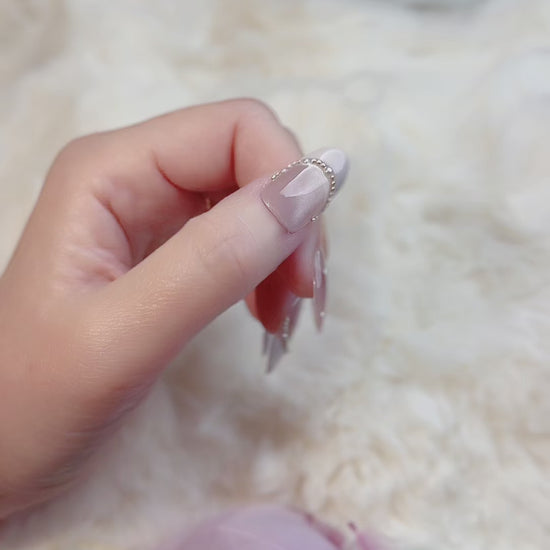 Fairy Frost- Crafted on a soft, sheer nude base, each almond-shaped nail features a frosty white French tip, hand-painted marble veining that looks like frost-kissed glass, and sparkling silver rhinestone accents for a touch of otherworldly glamour. The mix of sheer, matte, and shimmering textures creates a look that’s both whimsical and sophisticated, perfect for holiday parties, bridal events, or any day you want to feel like a magical vision.