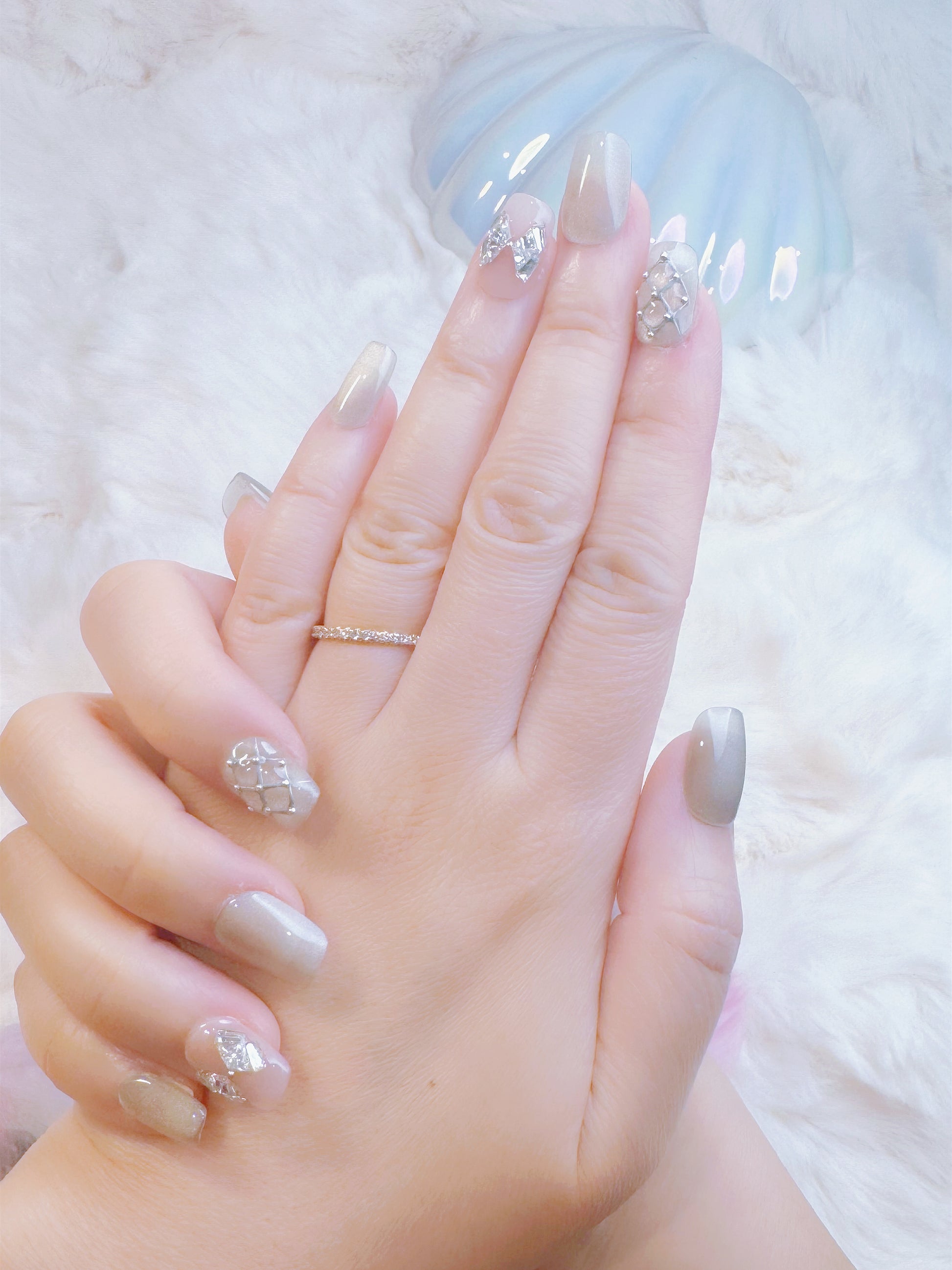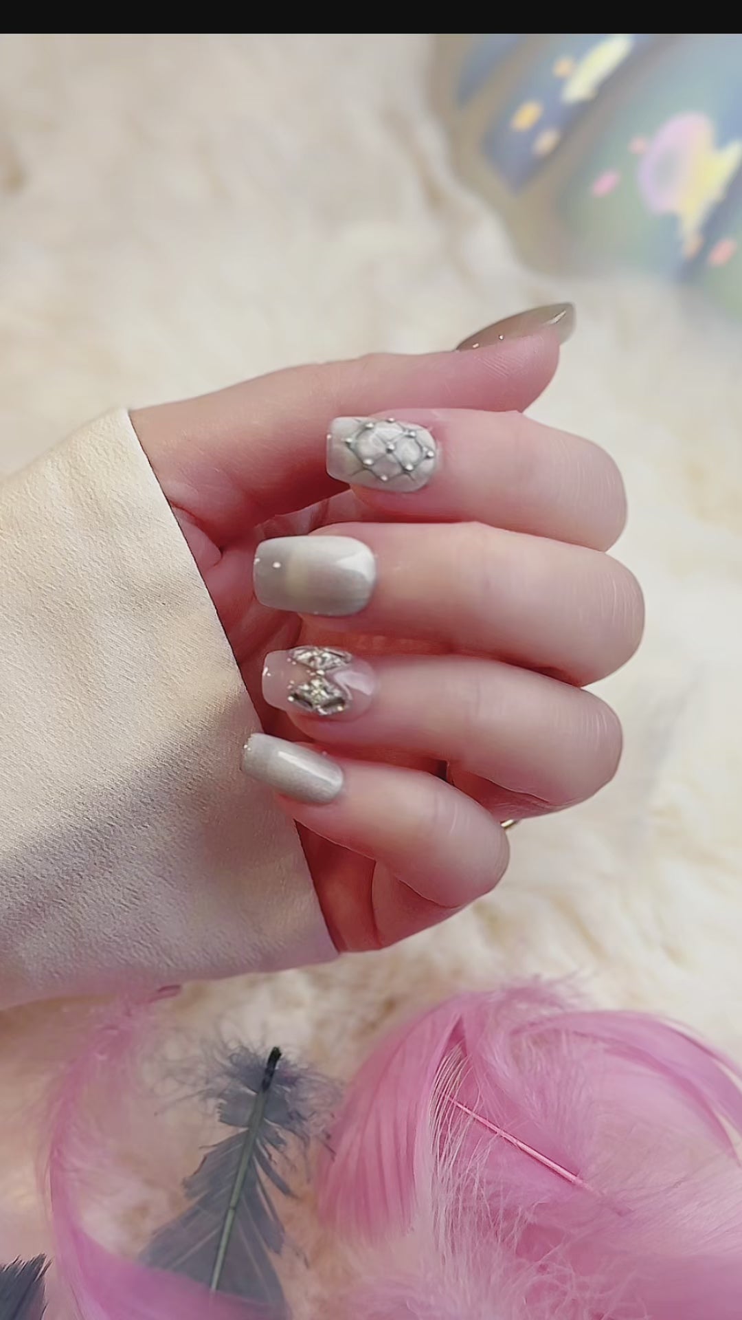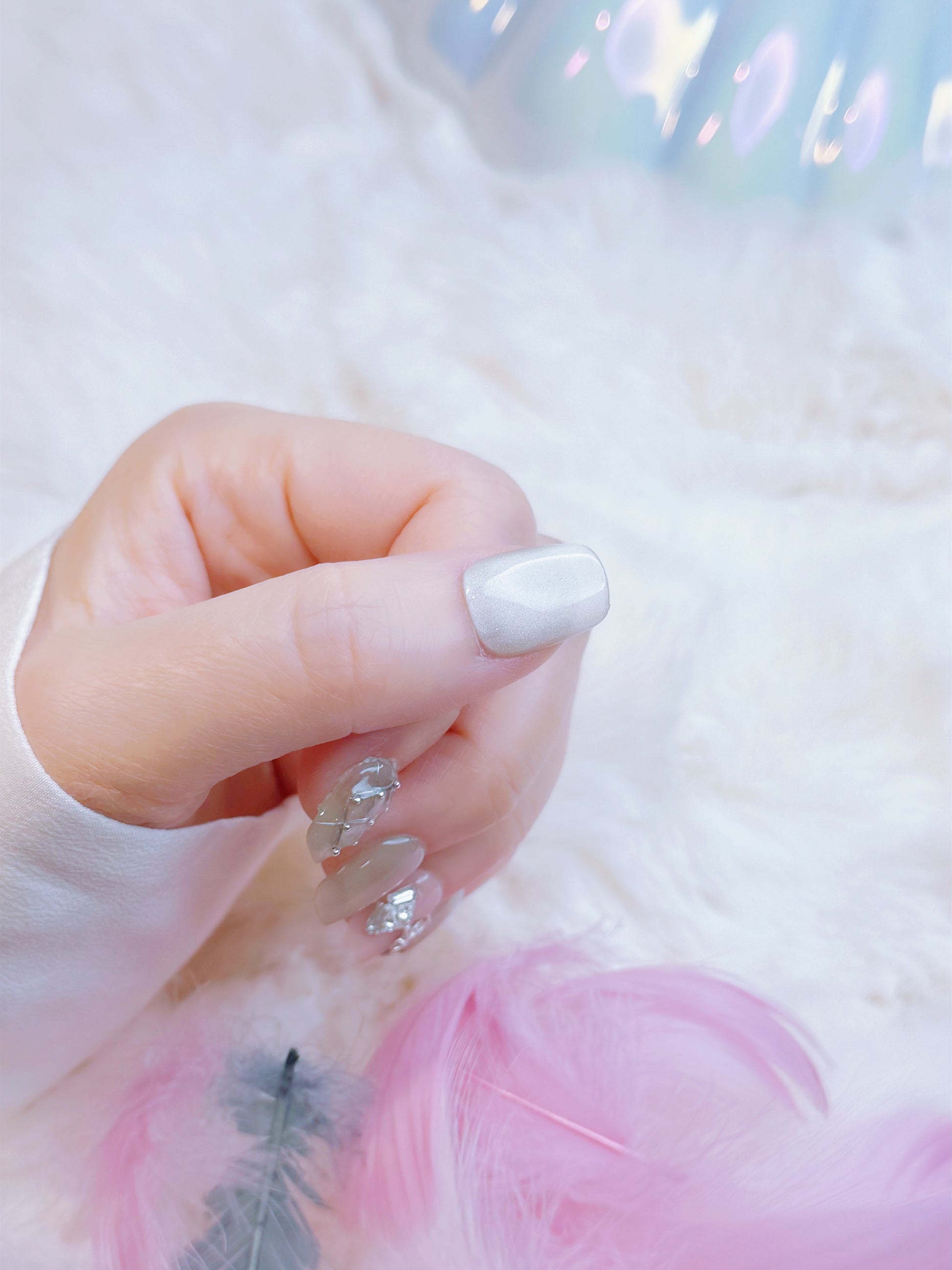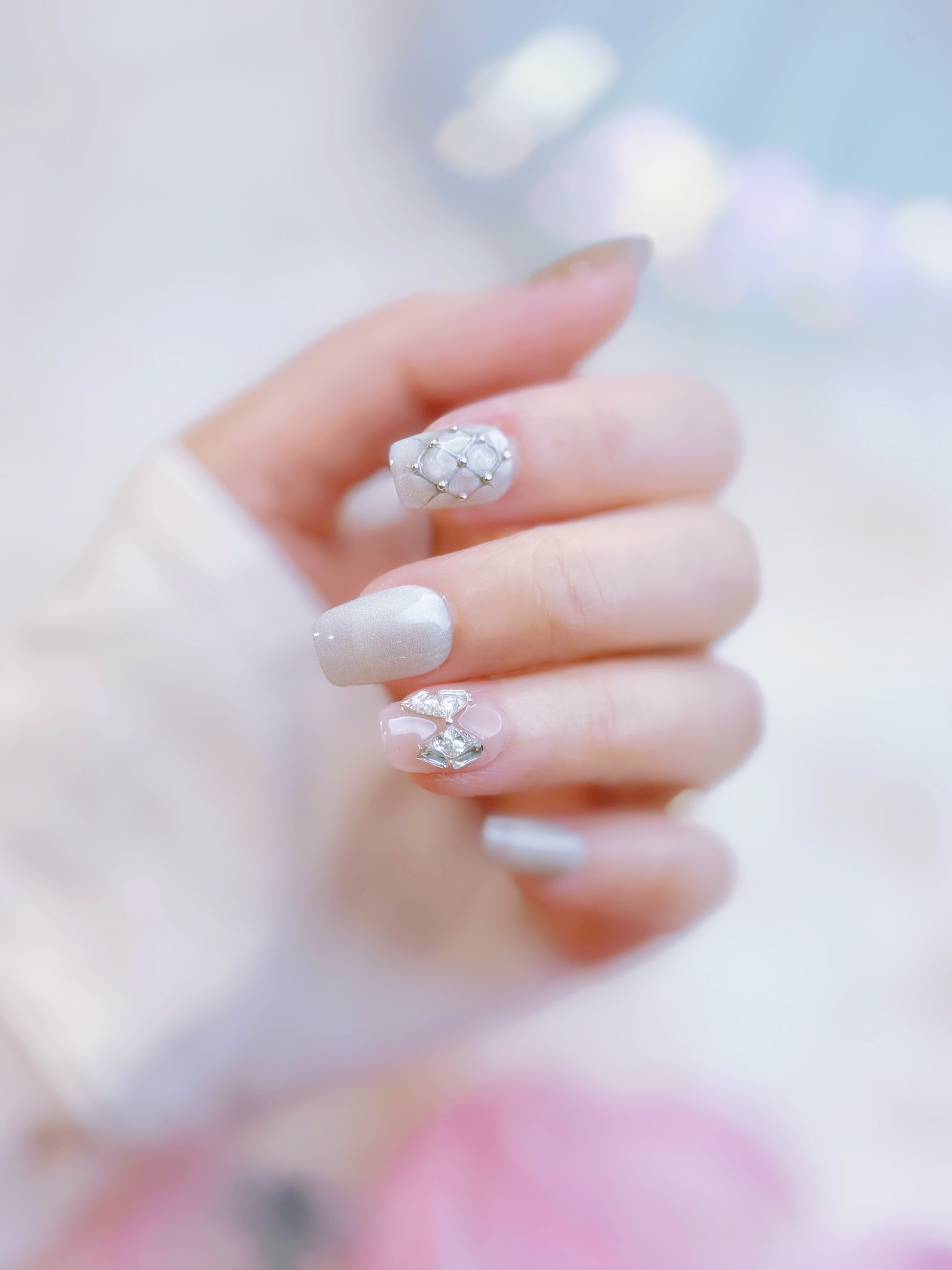 Ivory Whisper captures the beauty of quiet moments and soft elegance. A sheer ivory base blends seamlessly into the natural nail, glowing with a delicate, skin-like luminosity. Subtle silver accents and refined textured details add a gentle shimmer, as if light is resting softly on the surface. Romantic yet understated, this set feels intimate and timeless, designed for days when simplicity speaks louder than statement. Ivory Whisper lingers with a sense of calm, grace, and effortless beauty.